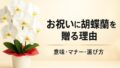 ナレッジ お祝い事に胡蝶蘭を贈るのはなぜ?—意味・マナー・選び方をやさしく解説 贈り物に迷ったとき、失礼なく格調高く伝えられるのが胡蝶蘭(こちょうらん)。品のある見た目、長く咲く実用性、「幸福が飛んでくる」という花言葉までそろい、開店・就任・移転・受賞などフォーマルなお祝いに最適です。本記事では、選ばれる理由から色・本... 2025.10.23 ナレッジ