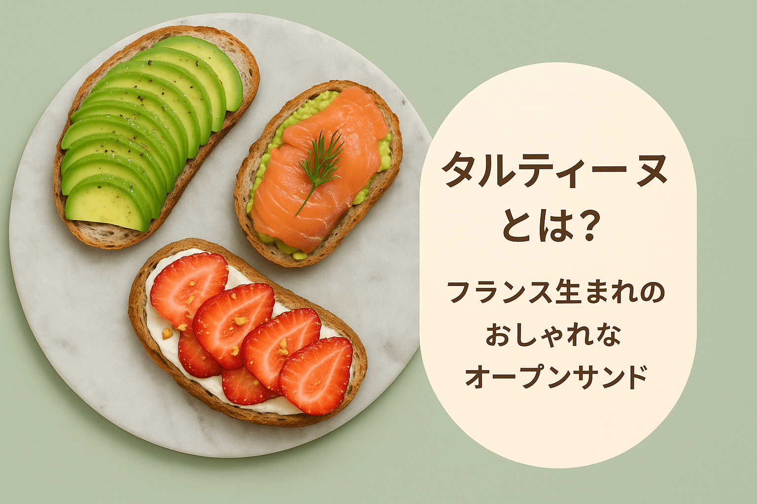 - タルティーヌとは、フランス語で「パンに塗ったもの」を意味し、オープンサンド全般を指す言葉。