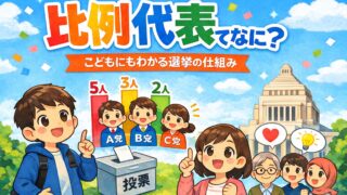 ナレッジ 比例代表ってなに?こどもにもわかる選挙のしくみ みなさんは「選挙(せんきょ)」って聞いたことがありますか?選挙は、みんなの代表を決めるために行われる大切な仕組みです。その中でも今日は比例代表(ひれいだいひょう)という少しむずかしそうな言葉を、やさしく説明します。1. 選挙では何を決めてい... 2026.01.27 ナレッジ